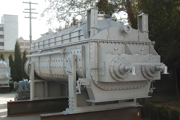 漿葉干燥機已成功地用于食品、化工、石化、染料、工業污泥等領域。設備傳熱、攪拌的特性使之可以完成以下單元操作:燃燒(低溫)、干燥(溶劑回收)加熱(融化)、反應。攪拌漿葉同時又是傳熱面,使單位容積內傳熱面積增大,縮短了處理時間。楔型漿葉傳熱面又具有自清潔功能。壓縮--膨脹攪拌功能使物料混和均勻。物料沿軸向成"活塞流"運動,在軸向區間內,物料的溫度、濕度、混合度梯度很小。用導熱油做熱介質漿葉干燥機可完成低溫燃燒工作。如:二水硫酸鈣(Ca2SO4·2H2O) 燃燒轉化為半水硫酸鈣(Ca2SO4·1/22H2O)。碳酸氫鈉(NaHCO3)經煅燒轉化為純堿(Na2HCO3)等。通入介質,如水、鹽水等即可用。如:使用于純堿行業的漿葉式涼堿機,取代老式的空氣涼堿機,節省了能源及尾氣處理設備,降低了操作費用。干燥,設備主要的功能,不使用熱空氣,使溶劑回收、能源消耗、環境控制處于易處理的理想狀態。對需回收溶劑、易燃易氧化熱敏性物料尤為適應。已廣泛用于精細化工、石化、染料行業。軸向區間內,溫度、濕度、混合度的均勻性,使得設備可用來加熱或融化,或進行一些固體物料反應。在復合肥及變性淀粉行業均已成功使用。